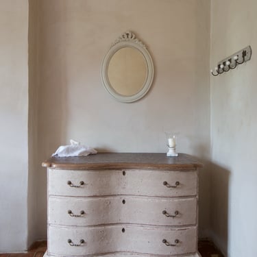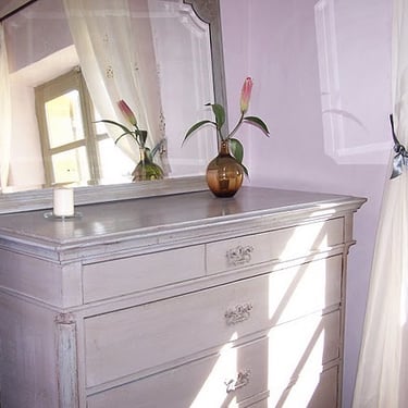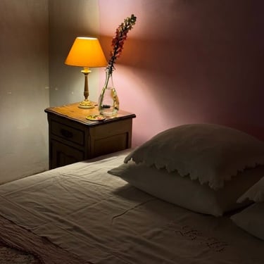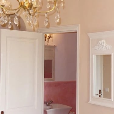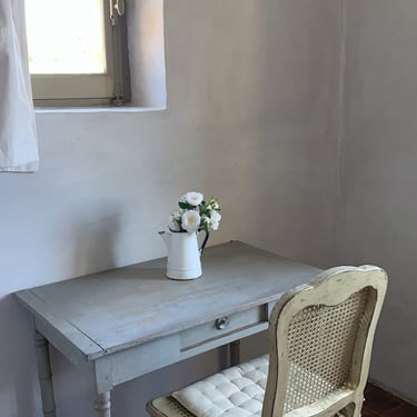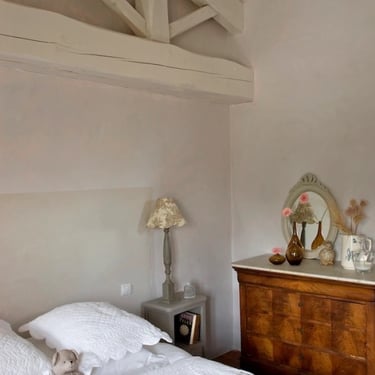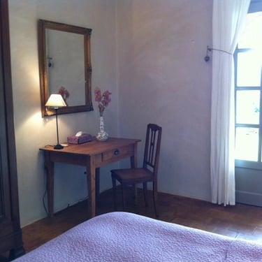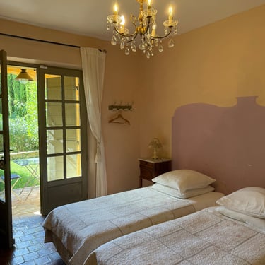 Sur le même palier que la chambre 4, aux couleurs pastels gris et rose cette chambre pour 2 se situe au premier étage côté sud, avec une vue sur les jardins et la piscine californienne.