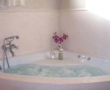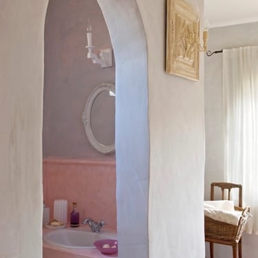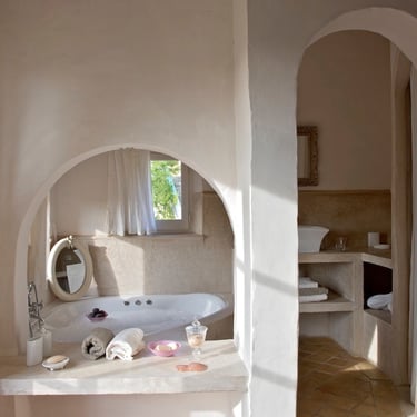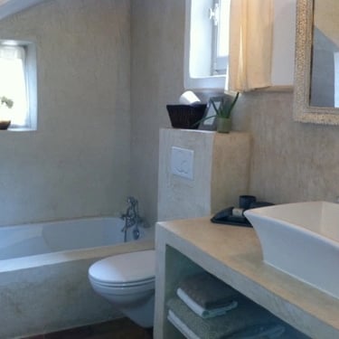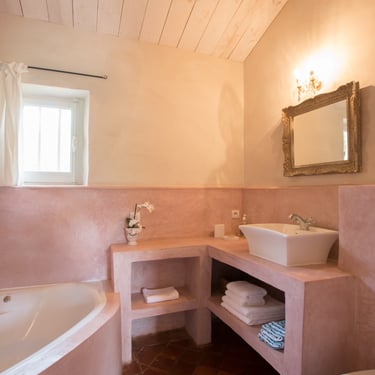 Avec sa salle de bain, une baignoire, une vasque sur plan tadelakt à l’ancienne et une toilette.