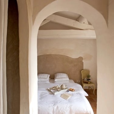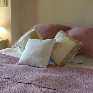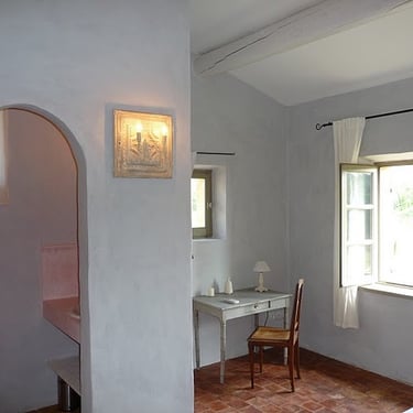En rez de jardin, cette chambre pour 2 se situe côté ouest avec une terrasse privative sous arche, vue sur un jardinet et la garrigue. Avec sa salle de bain, baignoire, une toilette et une vasque sur un plan tadelakt à l’ancienne.