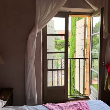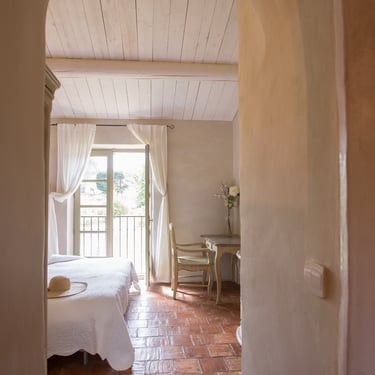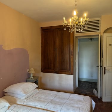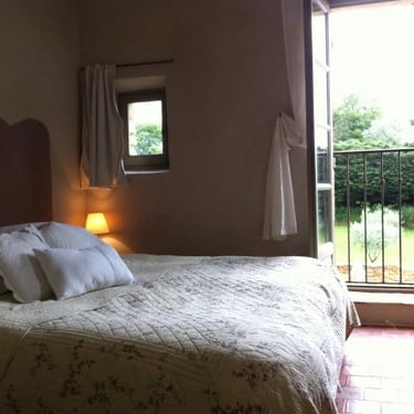 A coté de la chambre 5, pour 2 personnes, cette chambre romantique avec balcon se situe au premier étage côté ouest avec une magnifique vue sur la garrigue, le village d’Aigaliers et les Cévennes au loin.