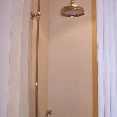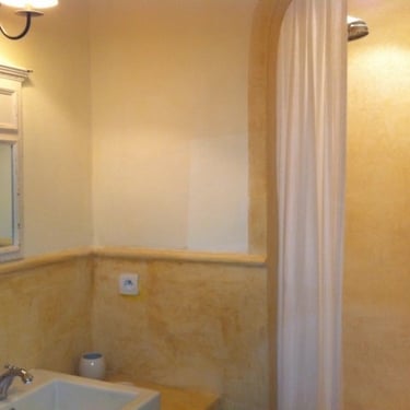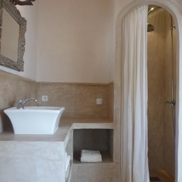 Avec une belle salle de bain de tadelakts à l’ancienne elle dispose d’une baignoire, douche à l’italienne séparée, un plan avec vasque, toilette en accès direct depuis la chambre.