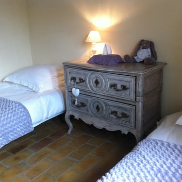 Sur le même palier, à côté de la chambre 2, aux couleurs pastels gris clair pour 2 personnes elle se situe au premier étage côté sud, avec une vue sur les jardins et la grande piscine.