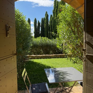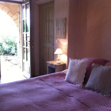 En rez de jardin côté ouest, cette chambre pour 2 avec une terrasse privative sous arcade donnant sur un jardinet, et une vue sur la garrigue.
