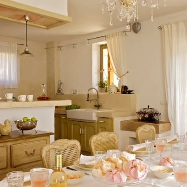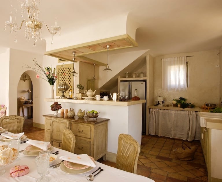 Chaque détail — lustres délicats, bois patiné, textiles naturels — crée une atmosphère douce et chaleureuse, propice aux moments de détente entre amis ou en famille.